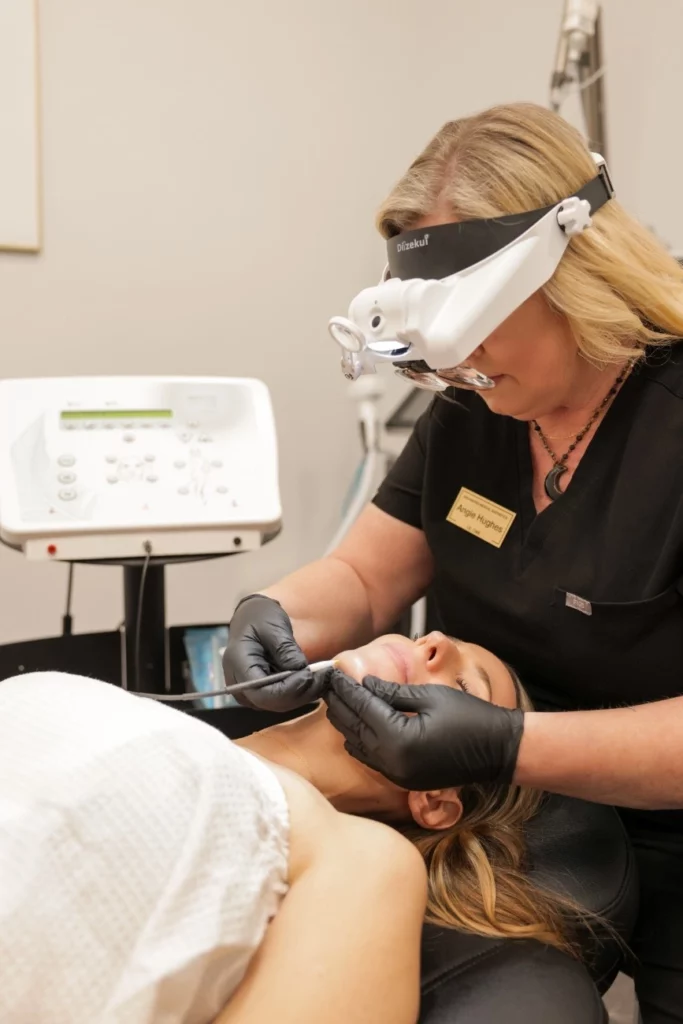 Experience smooth, flawless skin with Enchanted Medical Aesthetics’ professional electrolysis treatments, a safe, precise, and permanent solution to unwanted hair. Electrolysis in Ormond Beach, FL, uses a fine probe inserted into each individual hair follicle. A small electrical current is delivered to destroy the follicle, permanently stopping hair growth. This process is repeated for each hair, making it one of the most reliable and permanent methods of hair removal available. Unlike laser hair removal, electrolysis is effective for all skin tones and hair colors, including light, gray, or blonde hair. It’s especially ideal for smaller, more precise areas such as the face, neck, eyebrows, and underarms.