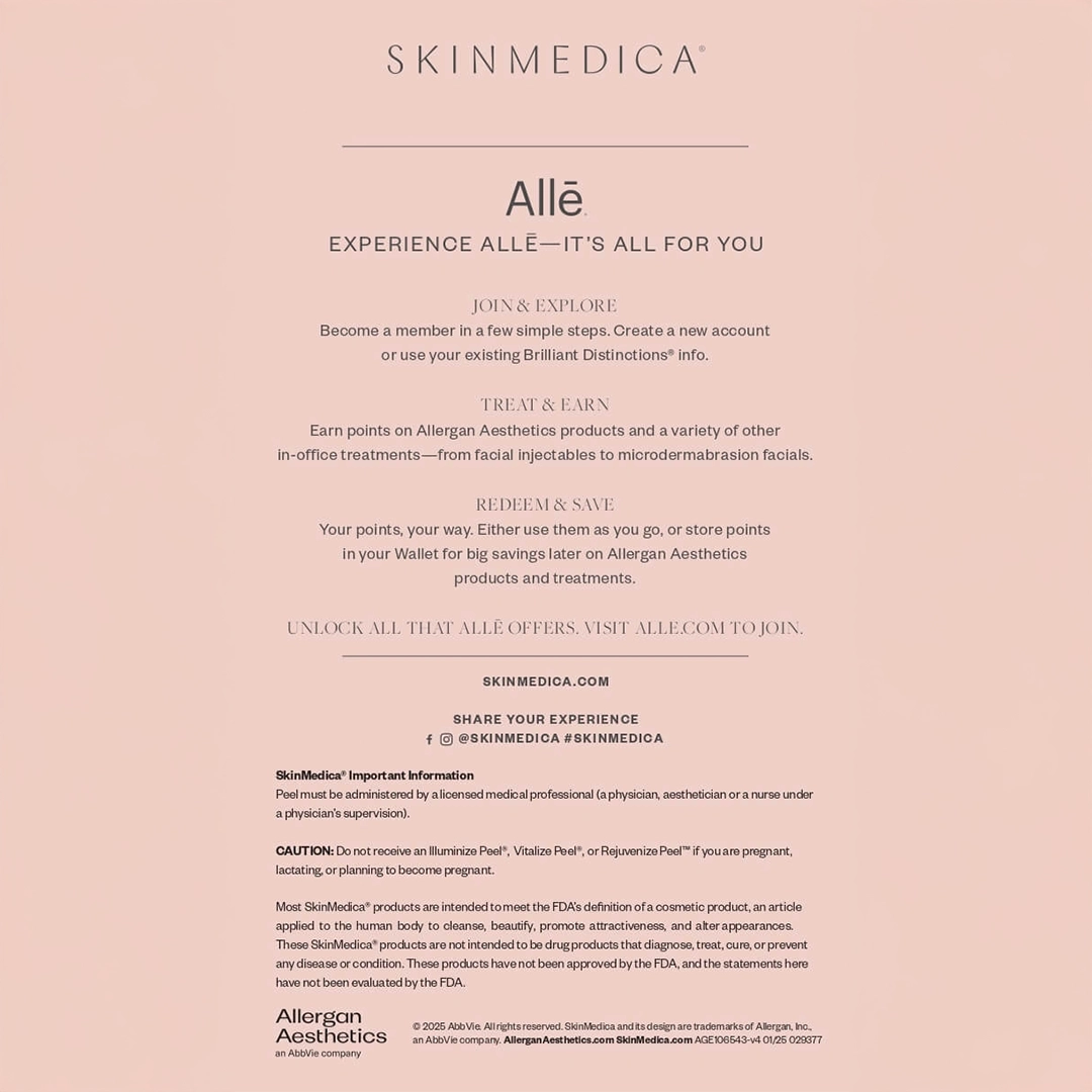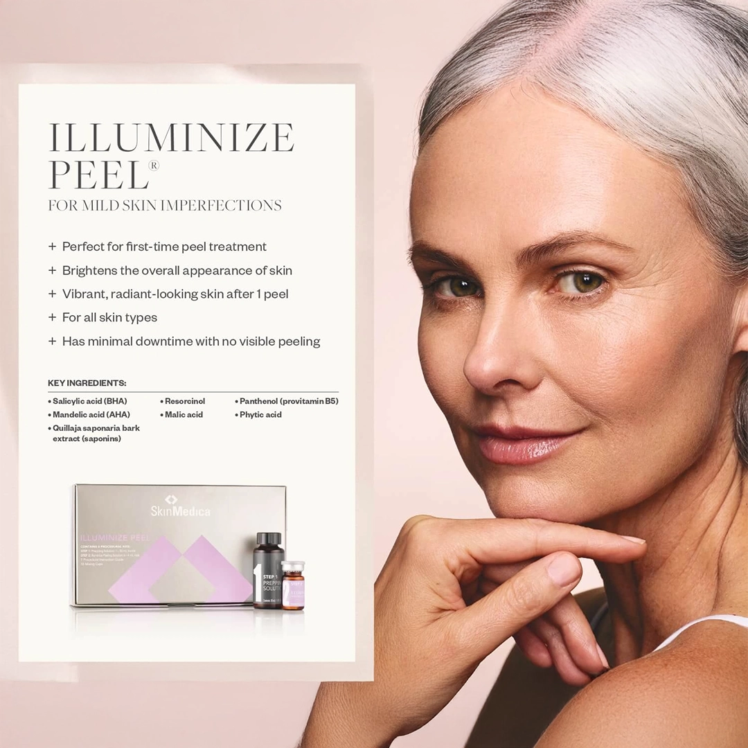 The SkinMedica Illuminize Peel is a gentle, superficial peel designed to brighten the skin and enhance its overall radiance with minimal downtime. Ideal for first-time chemical peel patients or those with mild skin imperfections, it combines a proprietary blend of alpha-hydroxy acids, beta-hydroxy acids, resorcinol, and retinoic acid to promote gentle exfoliation and skin renewal. The treatment helps improve skin clarity, tone, and texture, leaving the complexion looking refreshed, more even, and luminous after just one session. Suitable for all skin types, it offers a quick and effective way to achieve a healthy glow with little to no peeling.