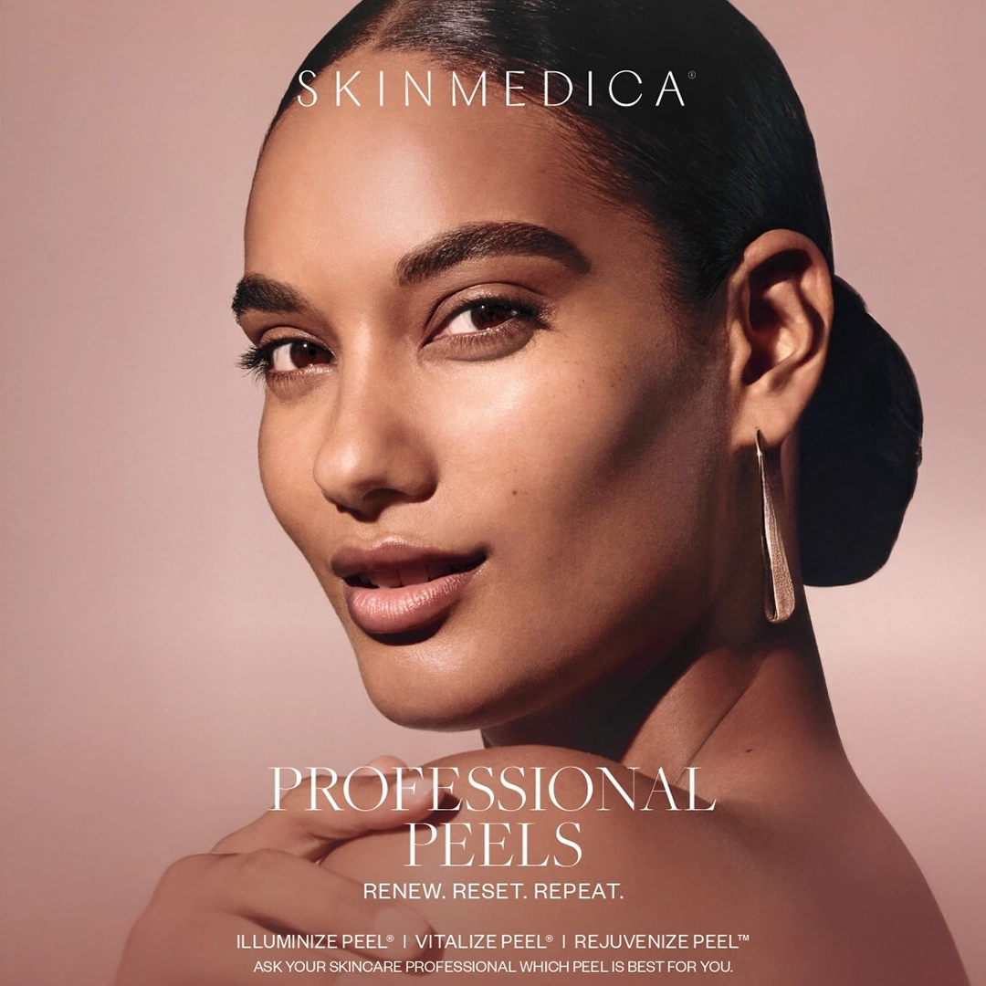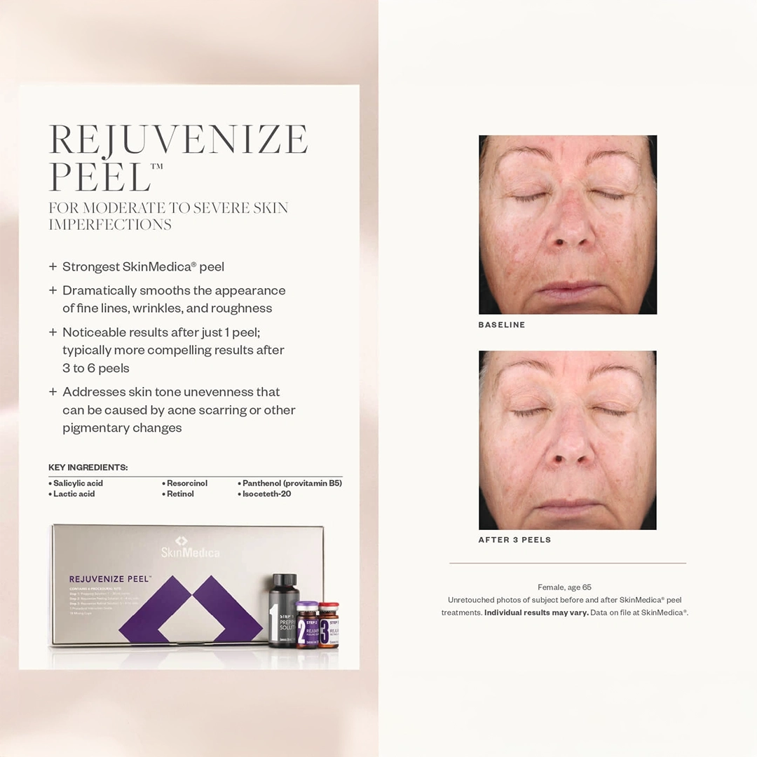 The SkinMedica Rejuvenize Peel is the brand’s most potent chemical peel, formulated to penetrate deep into the epidermis for controlled, dramatic exfoliation. Blending powerful agents such as salicylic, lactic, malic, mandelic, and phytic acids with resorcinol, retinol, and soothing panthenol, it effectively targets moderate-to-severe sun damage, fine lines, acne scars, hyperpigmentation and uneven texture. Results include smoother tone, diminished discoloration, and a brighter complexion even after one session, with more significant and cumulative results—like reduced wrinkles, age spots, and clearer skin after a series of peels spaced about four weeks apart. Because of its depth and potency, it’s usually recommended only after clients have tolerated lighter peels like SkinMedica’s Vitalize.