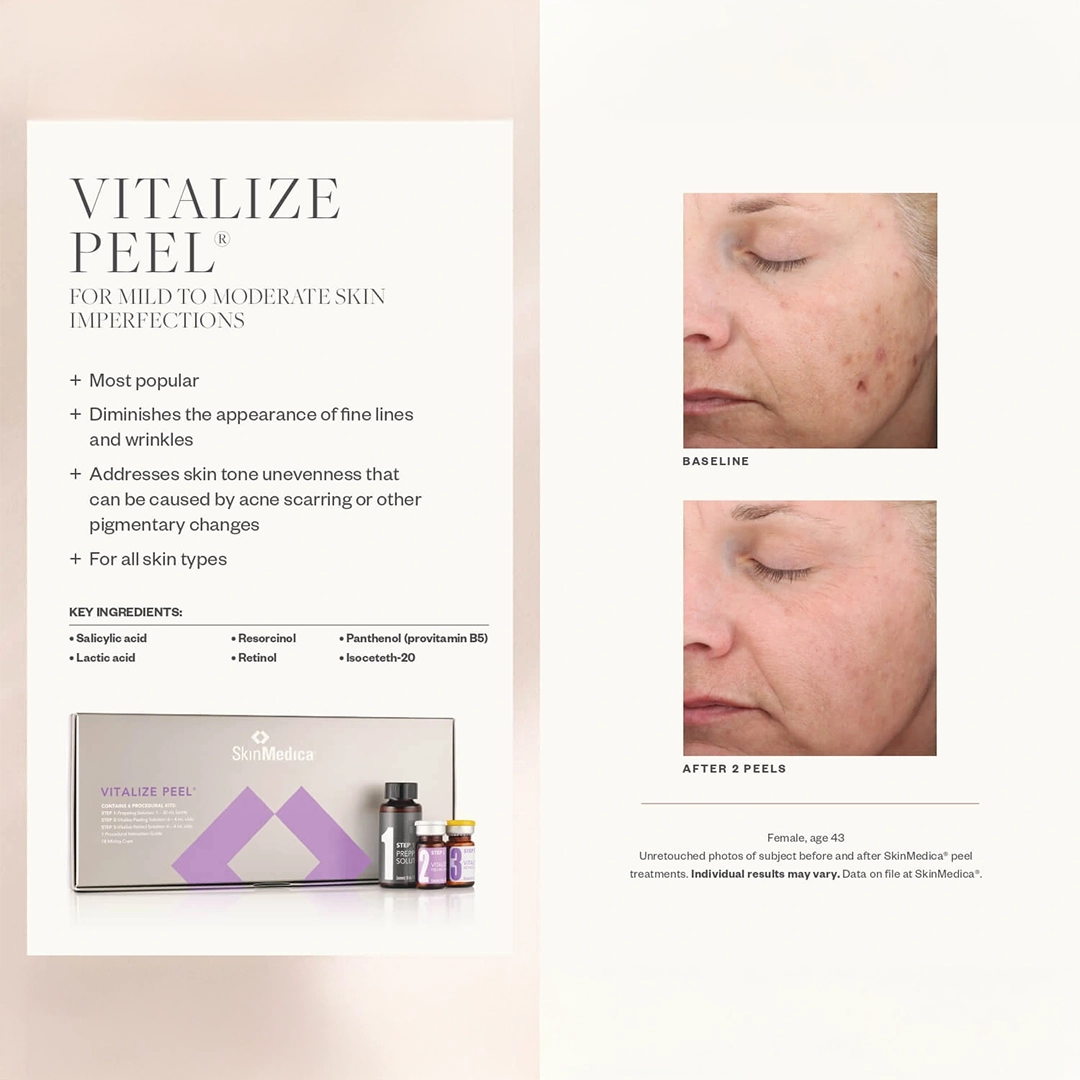 The SkinMedica Vitalize Peel is a medium-depth peel frequently selected to refresh skin tone and texture. It can help improve the appearance of fine lines, uneven pigmentation, dullness, and acne-related discoloration. Many patients see visible results after one session, with more noticeable improvement often achieved through a personalized series based on your skin goals.